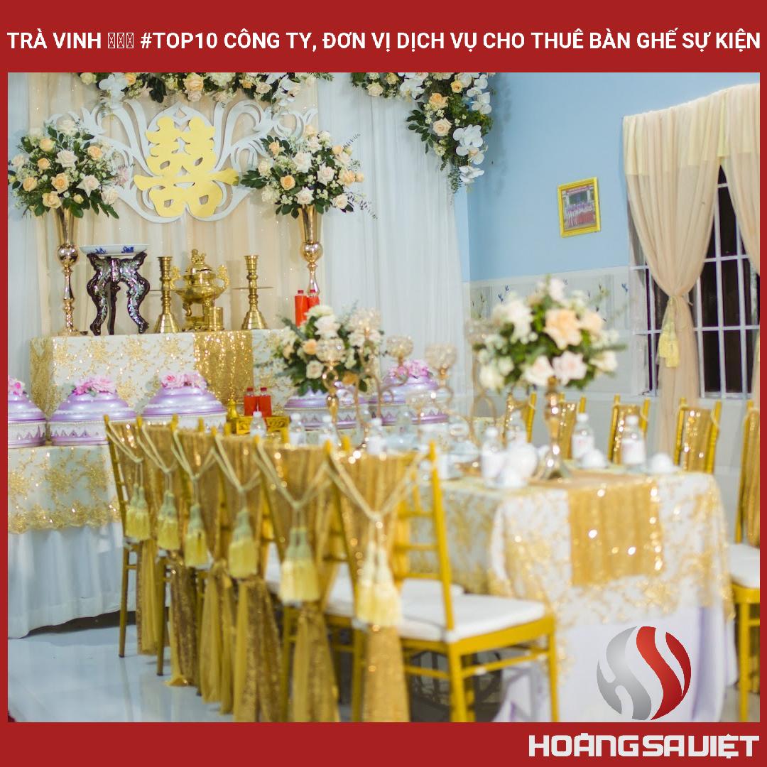 Trên đây là Danh Sách Công Ty tổ chức sự kiện, cho thuê trang thiết bị, Cho Thuê Bàn Ghế Tiệc & Bàn Ghế Sự Kiện, Đám Cưới: Banquet, Bar, Tiffany, Sofa, Bàn Tròn, Chữ Nhật, Cocktail tại Trà Vinh đã được Hoàng Sa Việt Tech khảo sát tại địa phương và cho kết quả từ: (⭐⭐⭐) trở lên.